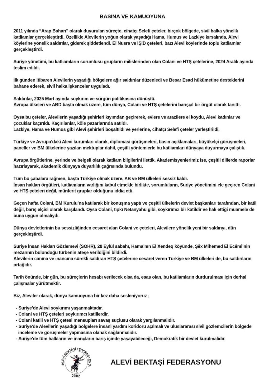 Alevi Bektaşi Federasyonu, Suriye’de son dönemde artan saldırılara dikkat çekerek uluslararası kamuoyuna acil çağrıda bulundu. Federasyonun yaptığı sert açıklamada, “Suriye’de Alevi soykırımı devam ediyor” denilerek, başta Türkiye, Avrupa Birliği ve Birleşmiş Milletler (BM) olmak üzere tüm uluslararası kurumların sessizliğinin saldırgan grupları cesaretlendirdiği vurgulandı.