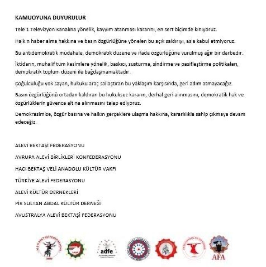 TELE1 Televizyonu’na kayyum atanması kararına karşı tepkiler çığ gibi büyüyor. Bu kez ortak bir açıklamayla ses yükselten Alevi örgütleri, kararı “demokrasiye ve halkın haber alma hakkına yönelik açık bir saldırı” olarak nitelendirdi.