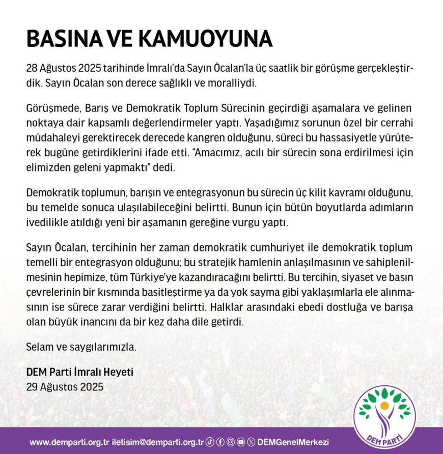 Parti yetkilileri, görüşmeye ilişkin detay paylaşmazken, önümüzdeki günlerde yeni açıklamaların yapılabileceğine işaret etti. Açıklamada ayrıca, parti olarak demokratik siyaseti büyütme ve çözüm yollarını güçlendirme yönündeki kararlılığın sürdüğü belirtildi.