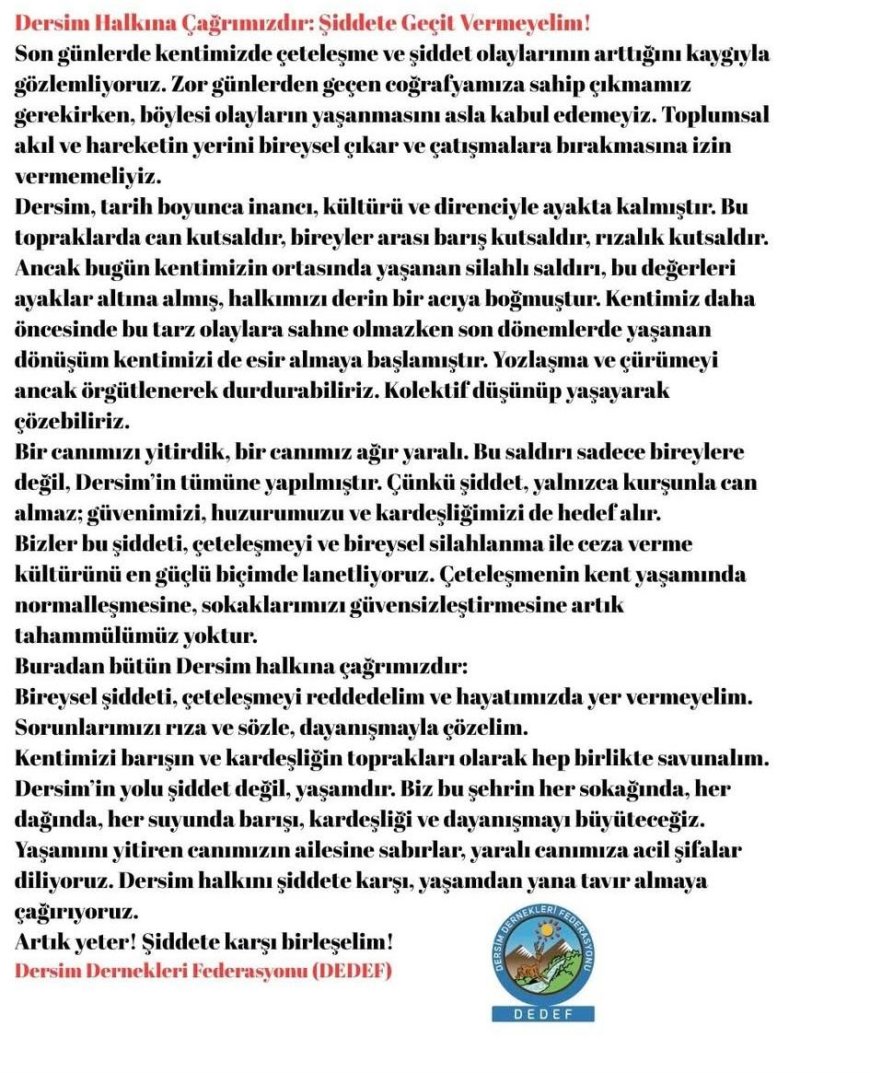 “Kentimizin ortasında yaşanan silahlı saldırı, halkımızı derin bir acıya boğmuştur. Bir canımızı yitirdik, bir canımız ağır yaralı. Bu saldırı sadece bireylere değil, Dersim’in tümüne yapılmıştır. Çünkü şiddet yalnızca kurşunla can almaz; güvenimizi, huzurumuzu ve kardeşliğimizi de hedef alır.”