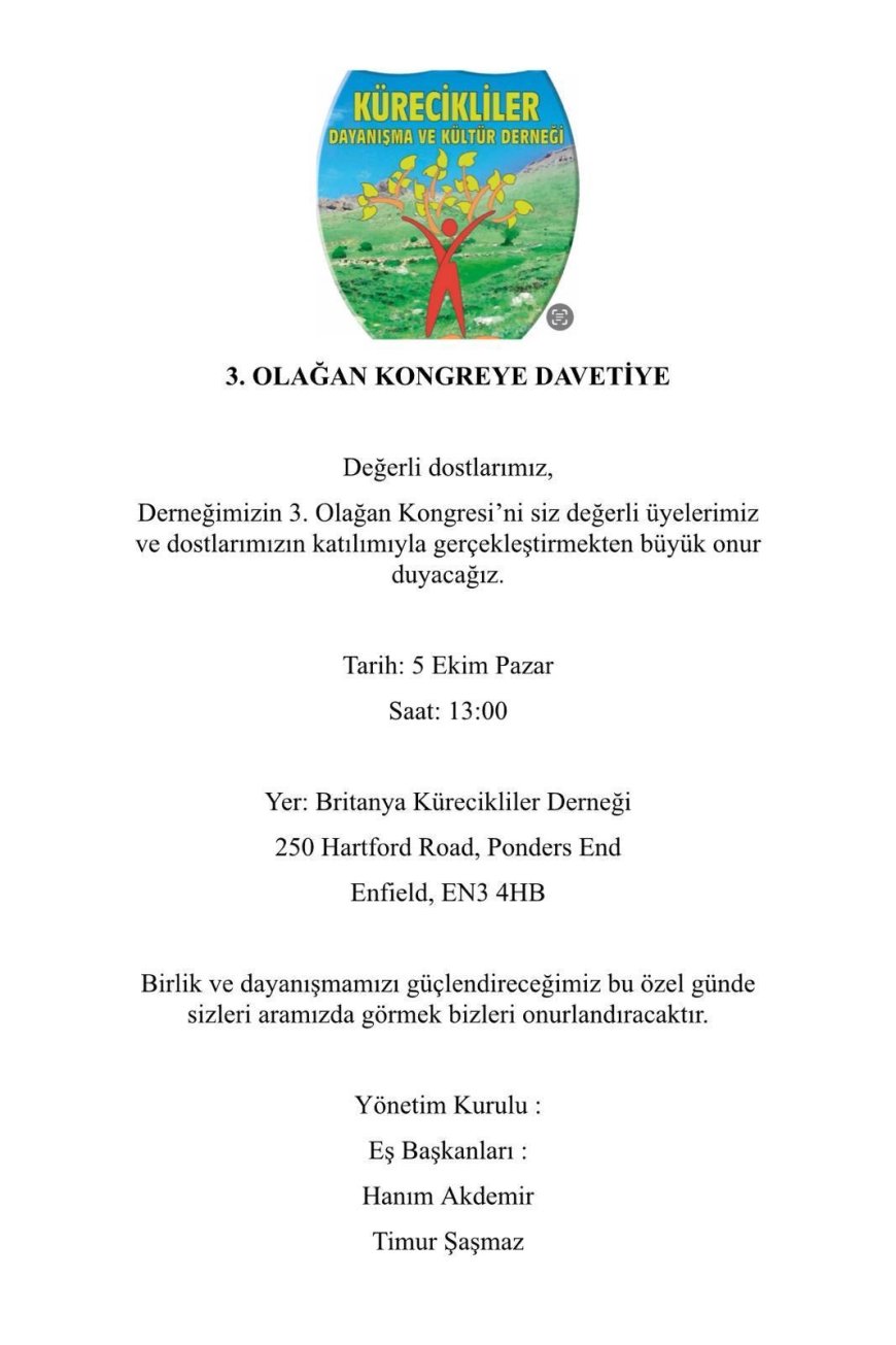 Britanya Kürecikliler Dayanışma ve Kültür Derneği, uzun süredir merakla beklenen 3. Olağan Kongresini, tüm gecikmelere rağmen 5 Ekim Pazar günü saat 13.00’te Enfield’de gerçekleştirmeye hazırlanıyor. Bu kongre, yalnızca yeni bir yönetim seçimi değil; Küreciklilerin dayanışmasını güçlendirecek, kültürel mirasına sahip çıkacak ve geleceğe dair yol haritasını belirleyecek tarihi bir dönüm noktası olacak.